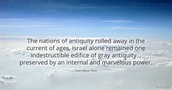 Wise, Isaac Mayer. "The nations of antiquity rolled away in the current of ages, Israel alone remained one indestructible edifice of gray antiquity... preserved by an internal and marvelous power." FixQuotes. January 15, 2026. https://fixquotes.com/quotes/the-nations-of-antiquity-rolled-away-in-the-169992/.