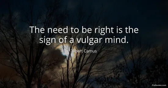 Camus, Albert. (2026, January 15). The need to be right is the sign of a vulgar mind. FixQuotes. https://fixquotes.com/quotes/the-need-to-be-right-is-the-sign-of-a-vulgar-mind-22900/