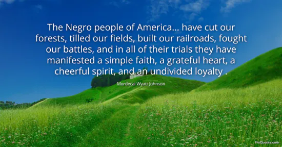 Johnson, Mordecai Wyatt. (2026, January 16). The Negro people of America... have cut our forests, tilled our fields, built our railroads, fought our battles, and in all of their trials they have manifested a simple faith, a grateful heart, a cheerful spirit, and an undivided loyalty . FixQuotes. https://fixquotes.com/quotes/the-negro-people-of-america-have-cut-our-forests-123506/