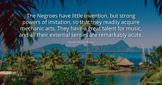 Morton, Samuel George. "The Negroes have little invention, but strong powers of imitation, so that they readily acquire mechanic arts. They have a great talent for music, and all their external senses are remarkably acute." FixQuotes. January 16, 2026. https://fixquotes.com/quotes/the-negroes-have-little-invention-but-strong-98701/.