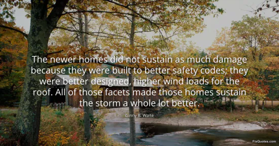 Waite, Ginny B. (2026, January 17). The newer homes did not sustain as much damage because they were built to better safety codes; they were better designed, higher wind loads for the roof. All of those facets made those homes sustain the storm a whole lot better. FixQuotes. https://fixquotes.com/quotes/the-newer-homes-did-not-sustain-as-much-damage-58799/
