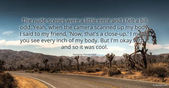 Henstridge, Natasha. "The nude scenes were a little eerie and I felt a bit odd. Yeah, when the camera scanned up my body, I said to my friend, 'Now, that's a close-up.' I mean, you see every inch of my body. But I'm okay with it and so it was cool." FixQuotes. January 15, 2026. https://fixquotes.com/quotes/the-nude-scenes-were-a-little-eerie-and-i-felt-a-143383/.