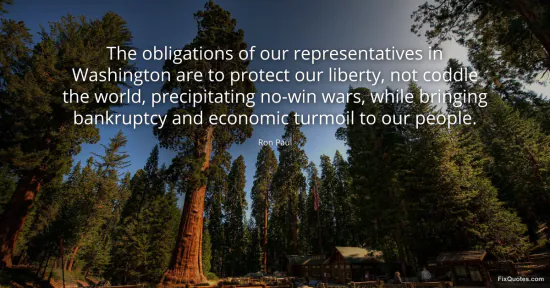 Paul, Ron. (2026, January 17). The obligations of our representatives in Washington are to protect our liberty, not coddle the world, precipitating no-win wars, while bringing bankruptcy and economic turmoil to our people. FixQuotes. https://fixquotes.com/quotes/the-obligations-of-our-representatives-in-28125/