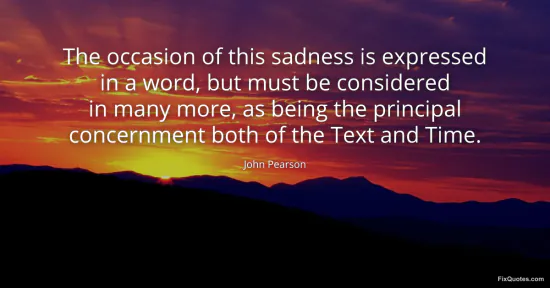 Pearson, John. (2026, January 16). The occasion of this sadness is expressed in a word, but must be considered in many more, as being the principal concernment both of the Text and Time. FixQuotes. https://fixquotes.com/quotes/the-occasion-of-this-sadness-is-expressed-in-a-106976/