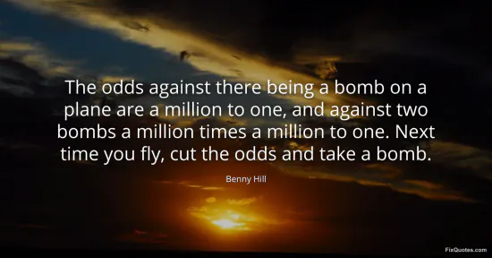 Hill, Benny. "The odds against there being a bomb on a plane are a million to one, and against two bombs a million times a million to one. Next time you fly, cut the odds and take a bomb." FixQuotes. January 14, 2026. https://fixquotes.com/quotes/the-odds-against-there-being-a-bomb-on-a-plane-30086/.