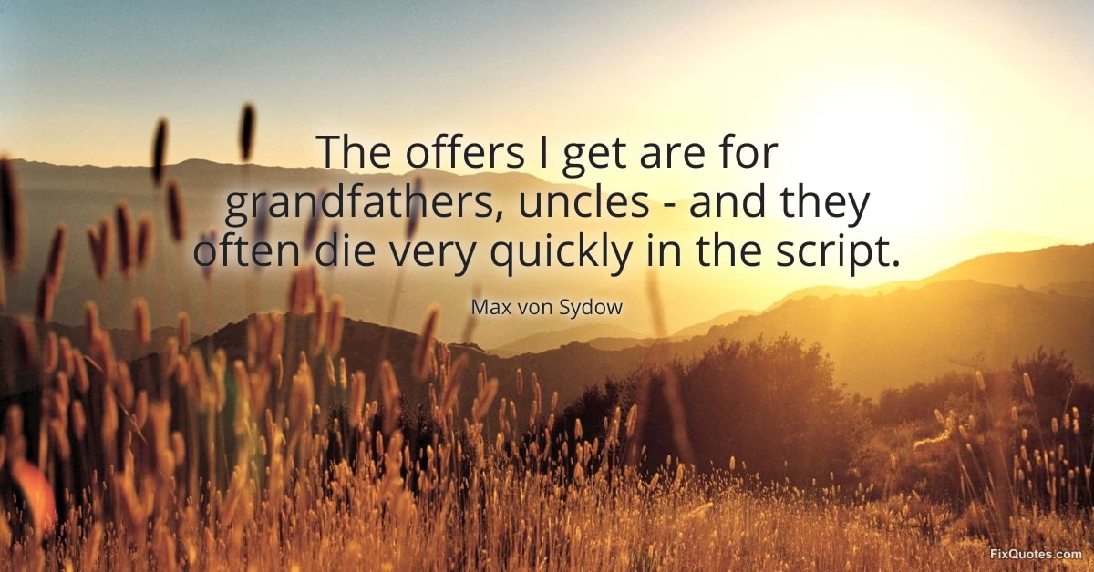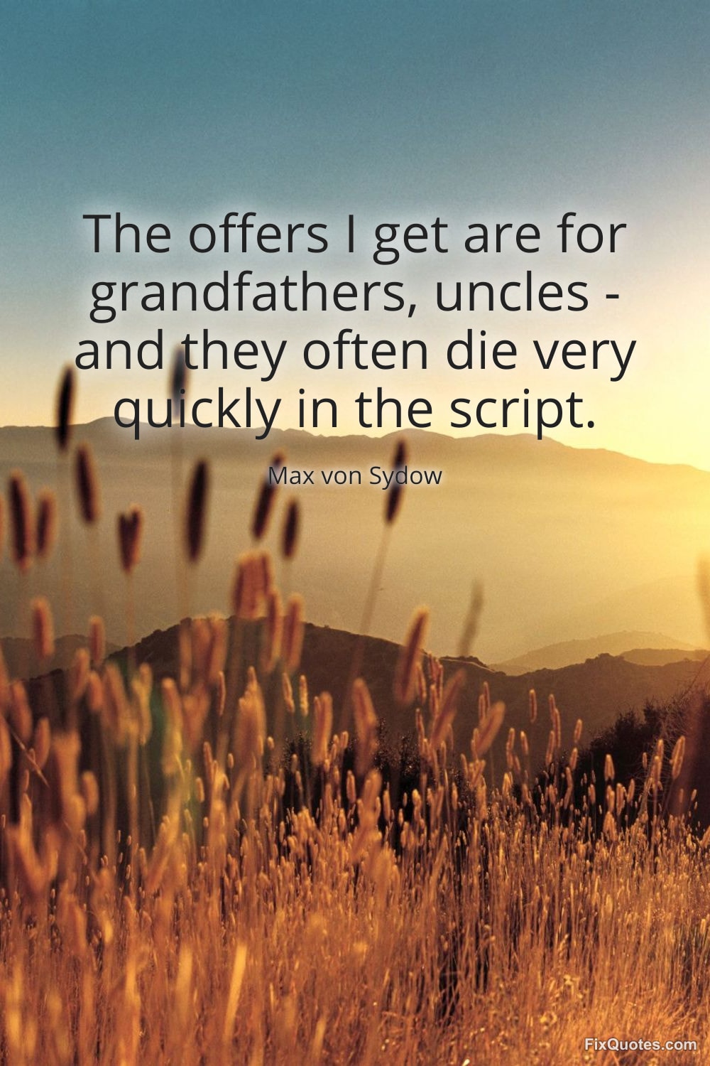 Sydow, Max von. "The offers I get are for grandfathers, uncles - and they often die very quickly in the script." FixQuotes. January 17, 2026. https://fixquotes.com/quotes/the-offers-i-get-are-for-grandfathers-uncles-73431/.