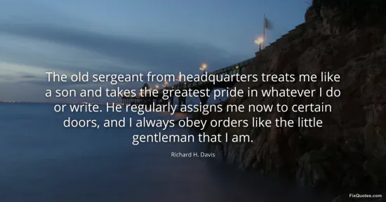 Davis, Richard H. (2026, January 15). The old sergeant from headquarters treats me like a son and takes the greatest pride in whatever I do or write. He regularly assigns me now to certain doors, and I always obey orders like the little gentleman that I am. FixQuotes. https://fixquotes.com/quotes/the-old-sergeant-from-headquarters-treats-me-like-155887/