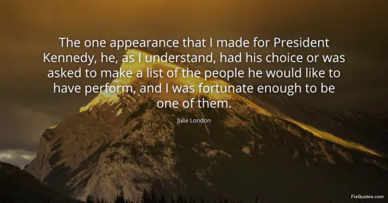 London, Julie. (2026, January 15). The one appearance that I made for President Kennedy, he, as I understand, had his choice or was asked to make a list of the people he would like to have perform, and I was fortunate enough to be one of them. FixQuotes. https://fixquotes.com/quotes/the-one-appearance-that-i-made-for-president-170790/