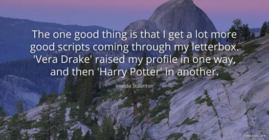 Staunton, Imelda. (2026, January 17). The one good thing is that I get a lot more good scripts coming through my letterbox. 'Vera Drake' raised my profile in one way, and then 'Harry Potter' in another. FixQuotes. https://fixquotes.com/quotes/the-one-good-thing-is-that-i-get-a-lot-more-good-73150/