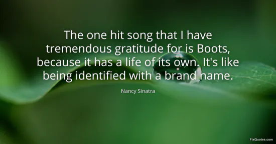 Sinatra, Nancy. "The one hit song that I have tremendous gratitude for is Boots, because it has a life of its own. It's like being identified with a brand name." FixQuotes. January 16, 2026. https://fixquotes.com/quotes/the-one-hit-song-that-i-have-tremendous-gratitude-82720/.
