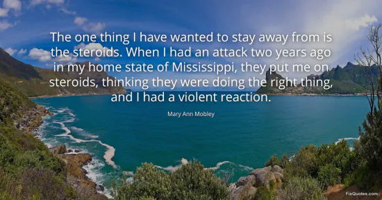 Mobley, Mary Ann. "The one thing I have wanted to stay away from is the steroids. When I had an attack two years ago in my home state of Mississippi, they put me on steroids, thinking they were doing the right thing, and I had a violent reaction." FixQuotes. January 15, 2026. https://fixquotes.com/quotes/the-one-thing-i-have-wanted-to-stay-away-from-is-150844/.