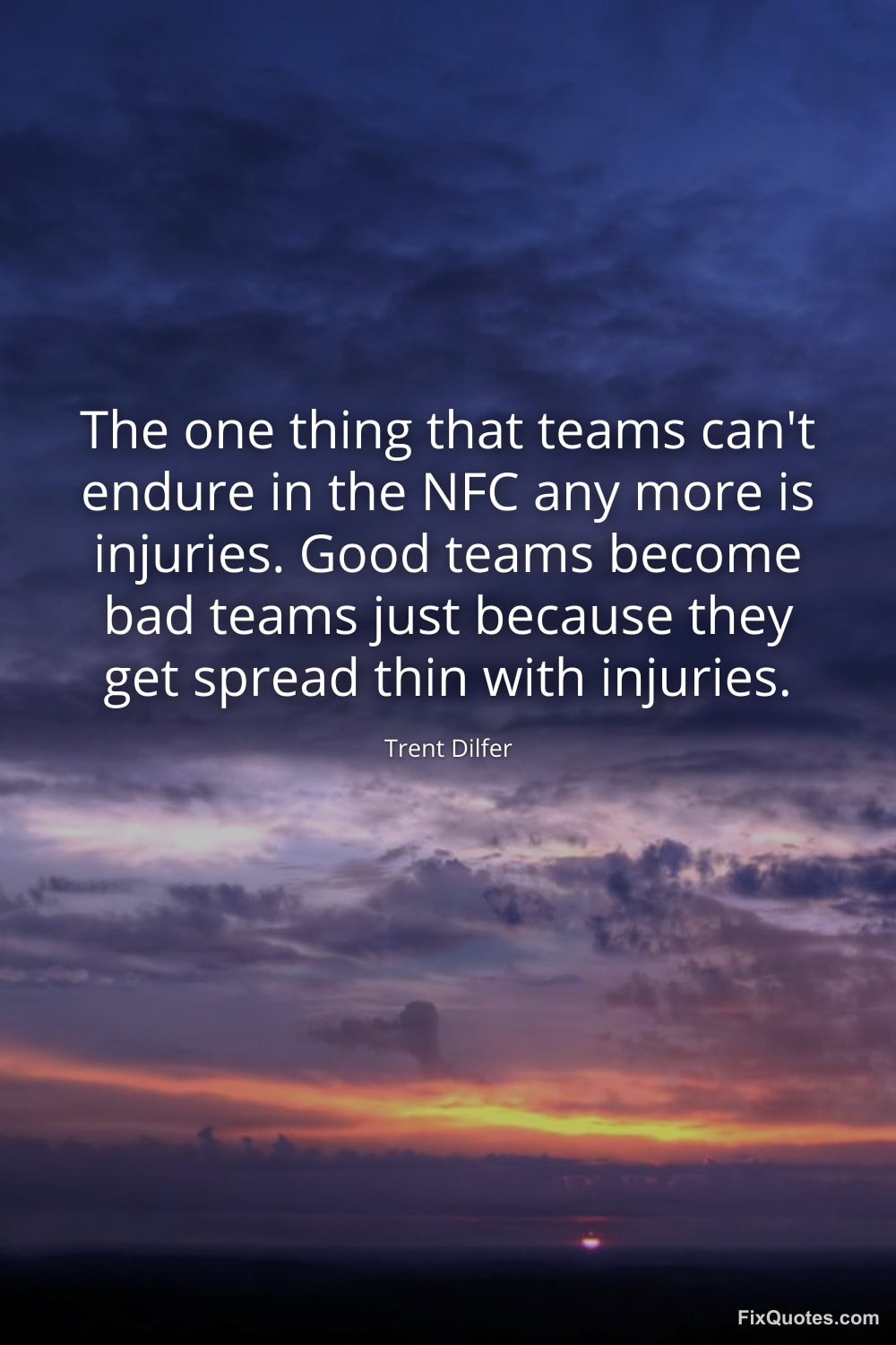 Dilfer, Trent. (2026, January 11). The one thing that teams can't endure in the NFC any more is injuries. Good teams become bad teams just because they get spread thin with injuries. FixQuotes. https://fixquotes.com/quotes/the-one-thing-that-teams-cant-endure-in-the-nfc-183716/