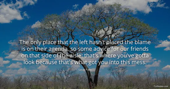 Palin, Sarah. "The only place that the left hasn't placed the blame is on their agenda, so some advice for our friends on that side of the aisle: that's where you've gotta look because that's what got you into this mess." FixQuotes. January 18, 2026. https://fixquotes.com/quotes/the-only-place-that-the-left-hasnt-placed-the-21134/.