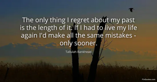 Bankhead, Tallulah. (2026, January 17). The only thing I regret about my past is the length of it. If I had to live my life again I'd make all the same mistakes - only sooner. FixQuotes. https://fixquotes.com/quotes/the-only-thing-i-regret-about-my-past-is-the-28636/