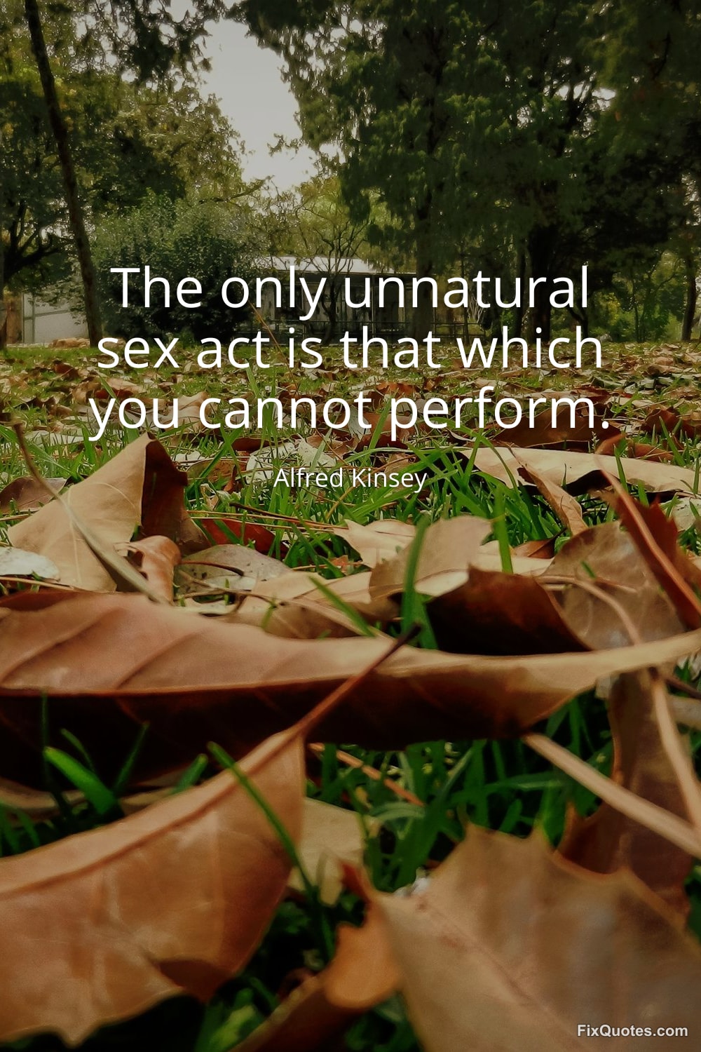 Kinsey, Alfred. (2026, January 17). The only unnatural sex act is that which you cannot perform. FixQuotes. https://fixquotes.com/quotes/the-only-unnatural-sex-act-is-that-which-you-40959/
