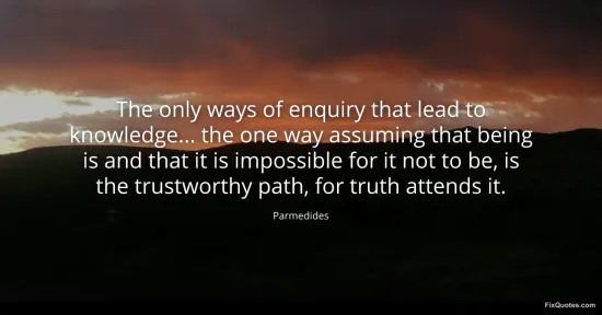 "The only ways of enquiry that lead to knowledge... the one way assuming that being is and that it is impossible for it not to be, is the trustworthy path, for truth attends it." FixQuotes, 15 Jan. 2026, https://fixquotes.com/quotes/the-only-ways-of-enquiry-that-lead-to-knowledge-89588/. Accessed 12 Feb. 2026.