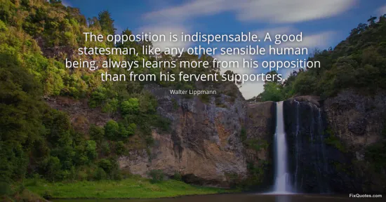 Lippmann, Walter. "The opposition is indispensable. A good statesman, like any other sensible human being, always learns more from his opposition than from his fervent supporters." FixQuotes. January 15, 2026. https://fixquotes.com/quotes/the-opposition-is-indispensable-a-good-statesman-98415/.