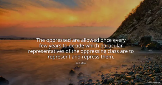 "The oppressed are allowed once every few years to decide which particular representatives of the oppressing class are to represent and repress them." FixQuotes, 15 Jan. 2026, https://fixquotes.com/quotes/the-oppressed-are-allowed-once-every-few-years-to-16591/. Accessed 13 Feb. 2026.