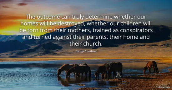 Smathers, George. (2026, January 17). The outcome can truly determine whether our homes will be destroyed, whether our children will be torn from their mothers, trained as conspirators and turned against their parents, their home and their church. FixQuotes. https://fixquotes.com/quotes/the-outcome-can-truly-determine-whether-our-homes-60065/