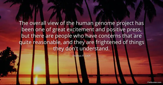 Cech, Thomas R. (2026, January 15). The overall view of the human genome project has been one of great excitement and positive press, but there are people who have concerns that are quite reasonable, and they are frightened of things they don't understand. FixQuotes. https://fixquotes.com/quotes/the-overall-view-of-the-human-genome-project-has-131435/