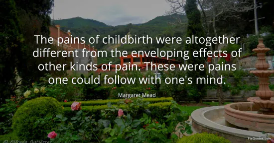 Mead, Margaret. "The pains of childbirth were altogether different from the enveloping effects of other kinds of pain. These were pains one could follow with one's mind." FixQuotes. January 17, 2026. https://fixquotes.com/quotes/the-pains-of-childbirth-were-altogether-different-34157/.