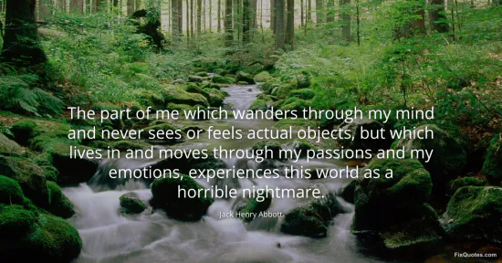Abbott, Jack Henry. "The part of me which wanders through my mind and never sees or feels actual objects, but which lives in and moves through my passions and my emotions, experiences this world as a horrible nightmare." FixQuotes. January 17, 2026. https://fixquotes.com/quotes/the-part-of-me-which-wanders-through-my-mind-and-44025/.