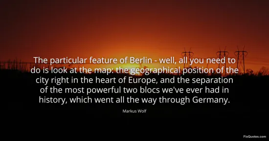 Wolf, Markus. (2026, January 15). The particular feature of Berlin - well, all you need to do is look at the map: the geographical position of the city right in the heart of Europe, and the separation of the most powerful two blocs we've ever had in history, which went all the way through Germany. FixQuotes. https://fixquotes.com/quotes/the-particular-feature-of-berlin-well-all-you-153807/