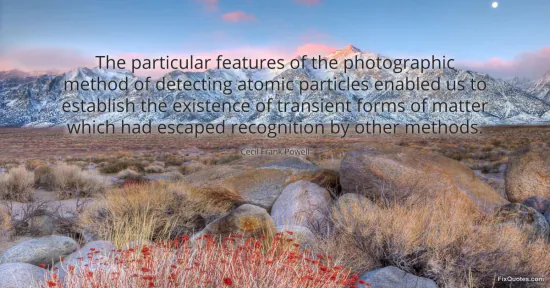 "The particular features of the photographic method of detecting atomic particles enabled us to establish the existence of transient forms of matter which had escaped recognition by other methods." FixQuotes, 16 Jan. 2026, https://fixquotes.com/quotes/the-particular-features-of-the-photographic-109949/. Accessed 13 Feb. 2026.
