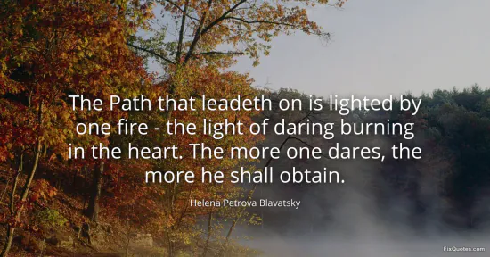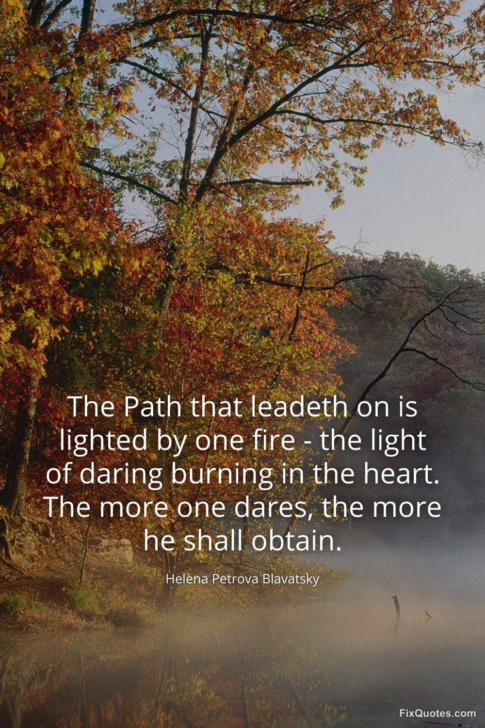 Blavatsky, Helena Petrova. "The Path that leadeth on is lighted by one fire - the light of daring burning in the heart. The more one dares, the more he shall obtain." FixQuotes. January 16, 2026. https://fixquotes.com/quotes/the-path-that-leadeth-on-is-lighted-by-one-fire-130956/.
