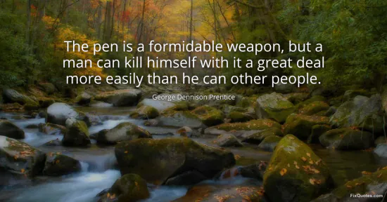 Prentice, George Dennison. "The pen is a formidable weapon, but a man can kill himself with it a great deal more easily than he can other people." FixQuotes. January 16, 2026. https://fixquotes.com/quotes/the-pen-is-a-formidable-weapon-but-a-man-can-kill-112175/.