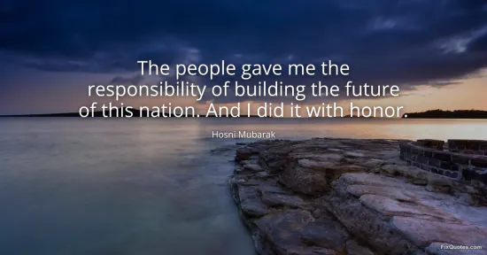 Mubarak, Hosni. (2026, January 17). The people gave me the responsibility of building the future of this nation. And I did it with honor. FixQuotes. https://fixquotes.com/quotes/the-people-gave-me-the-responsibility-of-building-56275/