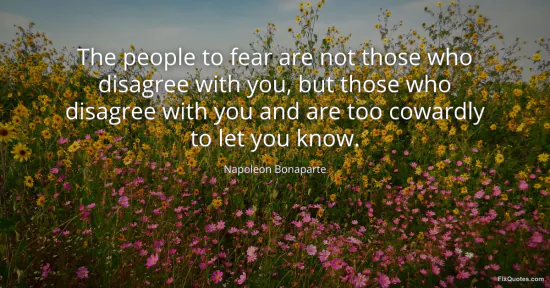 Bonaparte, Napoleon. "The people to fear are not those who disagree with you, but those who disagree with you and are too cowardly to let you know." FixQuotes. February 11, 2026. https://fixquotes.com/quotes/the-people-to-fear-are-not-those-who-disagree-14042/.