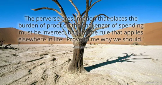 "The perverse presumption that places the burden of proof on the challenger of spending must be inverted, back to the rule that applies elsewhere in life: 'Prove to me why we should.'." FixQuotes, 17 Jan. 2026, https://fixquotes.com/quotes/the-perverse-presumption-that-places-the-burden-78488/. Accessed 12 Feb. 2026.
