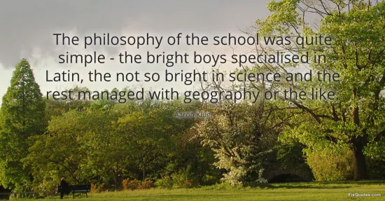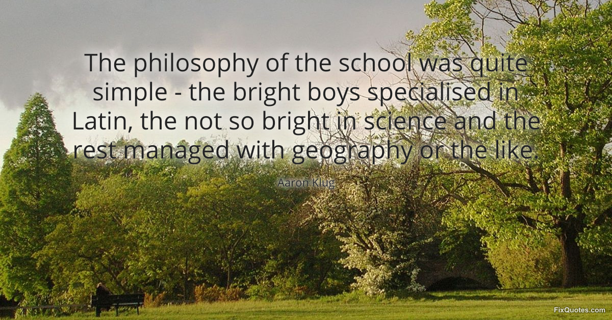 Klug, Aaron. "The philosophy of the school was quite simple - the bright boys specialised in Latin, the not so bright in science and the rest managed with geography or the like." FixQuotes. January 16, 2026. https://fixquotes.com/quotes/the-philosophy-of-the-school-was-quite-simple-119017/.