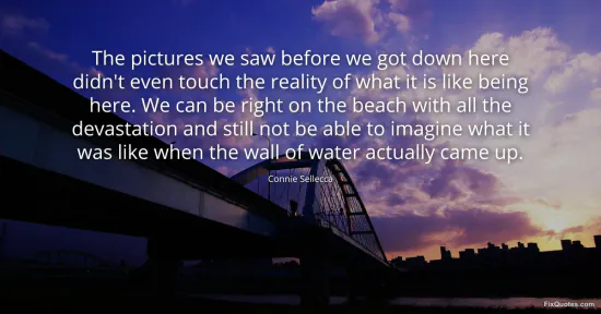 Sellecca, Connie. (2026, January 17). The pictures we saw before we got down here didn't even touch the reality of what it is like being here. We can be right on the beach with all the devastation and still not be able to imagine what it was like when the wall of water actually came up. FixQuotes. https://fixquotes.com/quotes/the-pictures-we-saw-before-we-got-down-here-didnt-50967/