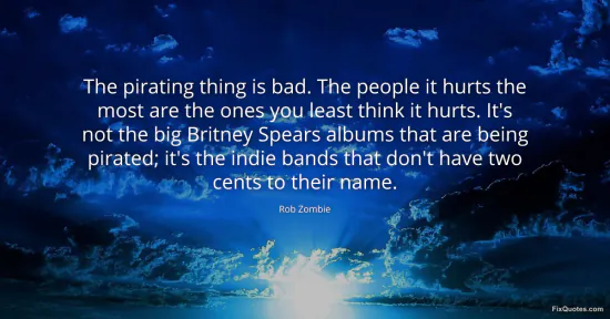 Zombie, Rob. (2026, January 15). The pirating thing is bad. The people it hurts the most are the ones you least think it hurts. It's not the big Britney Spears albums that are being pirated; it's the indie bands that don't have two cents to their name. FixQuotes. https://fixquotes.com/quotes/the-pirating-thing-is-bad-the-people-it-hurts-the-163801/