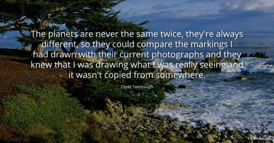 Tombaugh, Clyde. (2026, January 15). The planets are never the same twice, they're always different, so they could compare the markings I had drawn with their current photographs and they knew that I was drawing what I was really seeing and it wasn't copied from somewhere. FixQuotes. https://fixquotes.com/quotes/the-planets-are-never-the-same-twice-theyre-155126/