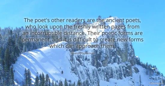 Quasimodo, Salvatore. (2026, January 17). The poet's other readers are the ancient poets, who look upon the freshly written pages from an incorruptible distance. Their poetic forms are permanent, and it is difficult to create new forms which can approach them. FixQuotes. https://fixquotes.com/quotes/the-poets-other-readers-are-the-ancient-poets-who-76760/