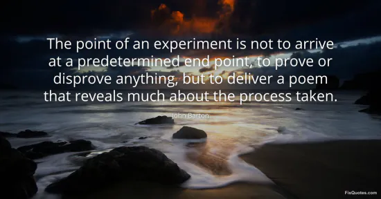 Barton, John. "The point of an experiment is not to arrive at a predetermined end point, to prove or disprove anything, but to deliver a poem that reveals much about the process taken." FixQuotes. January 15, 2026. https://fixquotes.com/quotes/the-point-of-an-experiment-is-not-to-arrive-at-a-93290/.