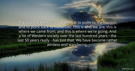 Straczynski, J. Michael. "The point of mythology or myth is to point to the horizon and to point back to ourselves: This is who we are; this is where we came from; and this is where we're going. And a lot of Western society over the last hundred years - the last 50 years really - has lost that. We have become rather aimless and wandering." FixQuotes. January 15, 2026. https://fixquotes.com/quotes/the-point-of-mythology-or-myth-is-to-point-to-the-163875/.
