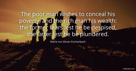 Ebner-Eschenbach, Marie von. "The poor man wishes to conceal his poverty, and the rich man his wealth: the former fears lest he be despised, the latter lest he be plundered." FixQuotes. January 15, 2026. https://fixquotes.com/quotes/the-poor-man-wishes-to-conceal-his-poverty-and-162330/.