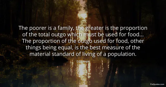 Engel, Ernst. "The poorer is a family, the greater is the proportion of the total outgo which must be used for food... The proportion of the outgo used for food, other things being equal, is the best measure of the material standard of living of a population." FixQuotes. January 15, 2026. https://fixquotes.com/quotes/the-poorer-is-a-family-the-greater-is-the-119336/.