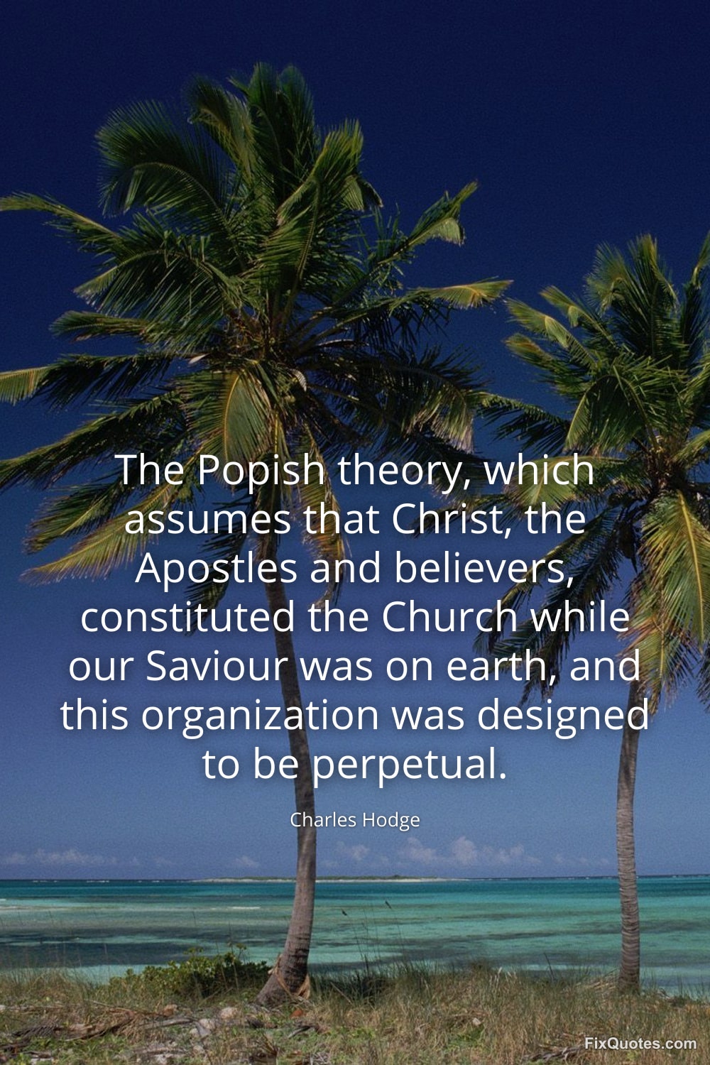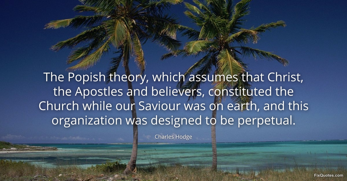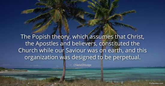 Hodge, Charles. "The Popish theory, which assumes that Christ, the Apostles and believers, constituted the Church while our Saviour was on earth, and this organization was designed to be perpetual." FixQuotes. January 18, 2026. https://fixquotes.com/quotes/the-popish-theory-which-assumes-that-christ-the-23040/.