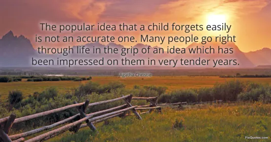 Christie, Agatha. (2026, January 18). The popular idea that a child forgets easily is not an accurate one. Many people go right through life in the grip of an idea which has been impressed on them in very tender years. FixQuotes. https://fixquotes.com/quotes/the-popular-idea-that-a-child-forgets-easily-is-12359/