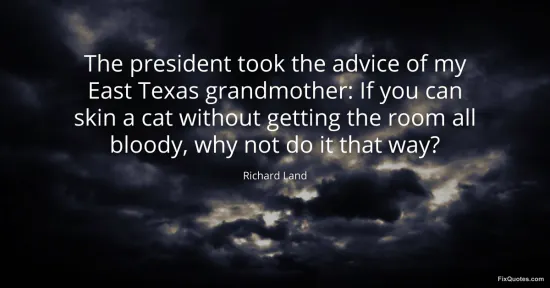 Land, Richard. (2026, January 16). The president took the advice of my East Texas grandmother: If you can skin a cat without getting the room all bloody, why not do it that way? FixQuotes. https://fixquotes.com/quotes/the-president-took-the-advice-of-my-east-texas-96872/