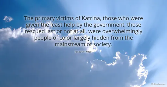 Kozol, Jonathan. "The primary victims of Katrina, those who were given the least help by the government, those rescued last or not at all, were overwhelmingly people of color largely hidden from the mainstream of society." FixQuotes. January 17, 2026. https://fixquotes.com/quotes/the-primary-victims-of-katrina-those-who-were-68567/.