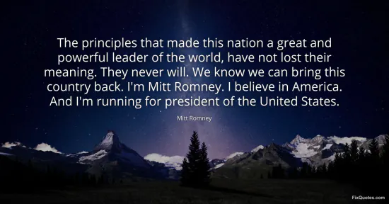 Romney, Mitt. "The principles that made this nation a great and powerful leader of the world, have not lost their meaning. They never will. We know we can bring this country back. I'm Mitt Romney. I believe in America. And I'm running for president of the United States." FixQuotes. January 17, 2026. https://fixquotes.com/quotes/the-principles-that-made-this-nation-a-great-and-28150/.