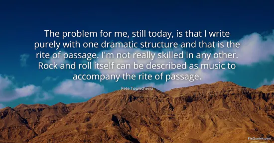 Townshend, Pete. "The problem for me, still today, is that I write purely with one dramatic structure and that is the rite of passage. I'm not really skilled in any other. Rock and roll itself can be described as music to accompany the rite of passage." FixQuotes. January 16, 2026. https://fixquotes.com/quotes/the-problem-for-me-still-today-is-that-i-write-83083/.