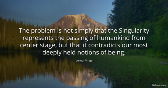 Vinge, Vernor. "The problem is not simply that the Singularity represents the passing of humankind from center stage, but that it contradicts our most deeply held notions of being." FixQuotes. January 17, 2026. https://fixquotes.com/quotes/the-problem-is-not-simply-that-the-singularity-58977/.