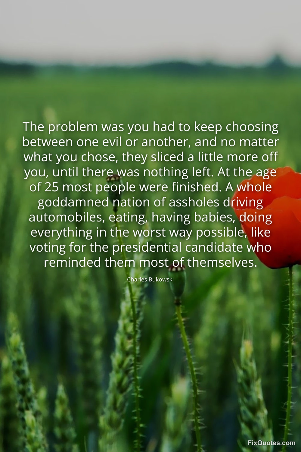 Bukowski, Charles. "The problem was you had to keep choosing between one evil or another, and no matter what you chose, they sliced a little more off you, until there was nothing left. At the age of 25 most people were finished. A whole goddamned nation of assholes driving automobiles, eating, having babies, doing everything in the worst way possible, like voting for the presidential candidate who reminded them most of themselves." FixQuotes. February 10, 2026. https://fixquotes.com/quotes/the-problem-was-you-had-to-keep-choosing-between-185132/.